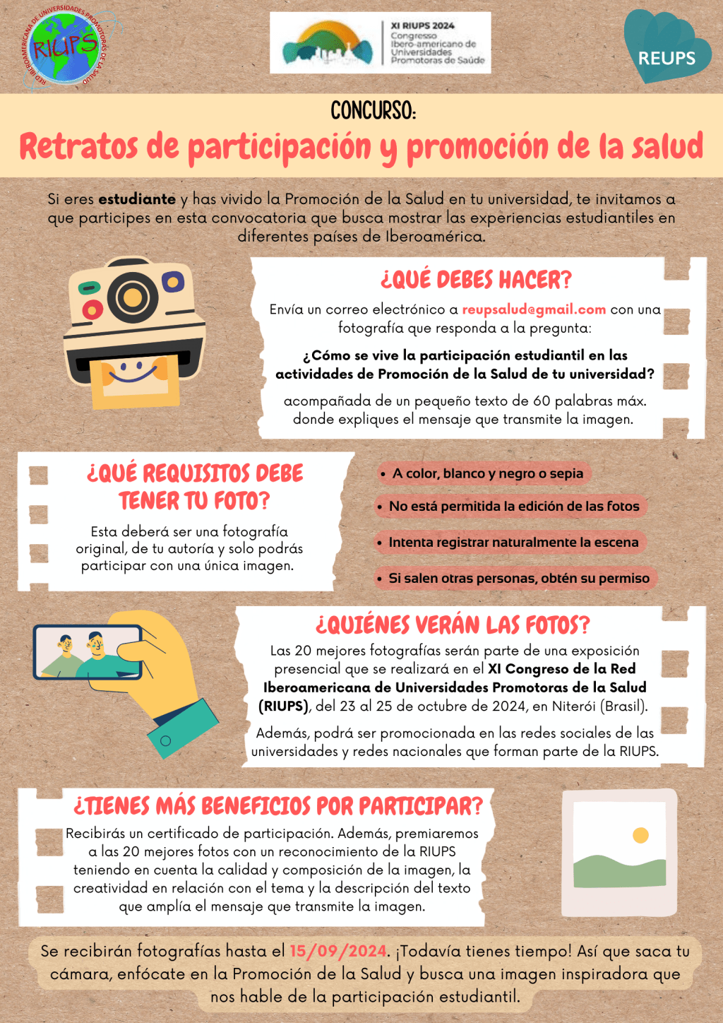La Comisión de Asuntos de Juventud y Participación de Estudiantes de la Red Iberoamericana de Universidades Promotoras de la Salud (RIUPS) organiza este concurso de fotografías de cara al XI Congreso de la RIUPS en Niterói (Brasil).